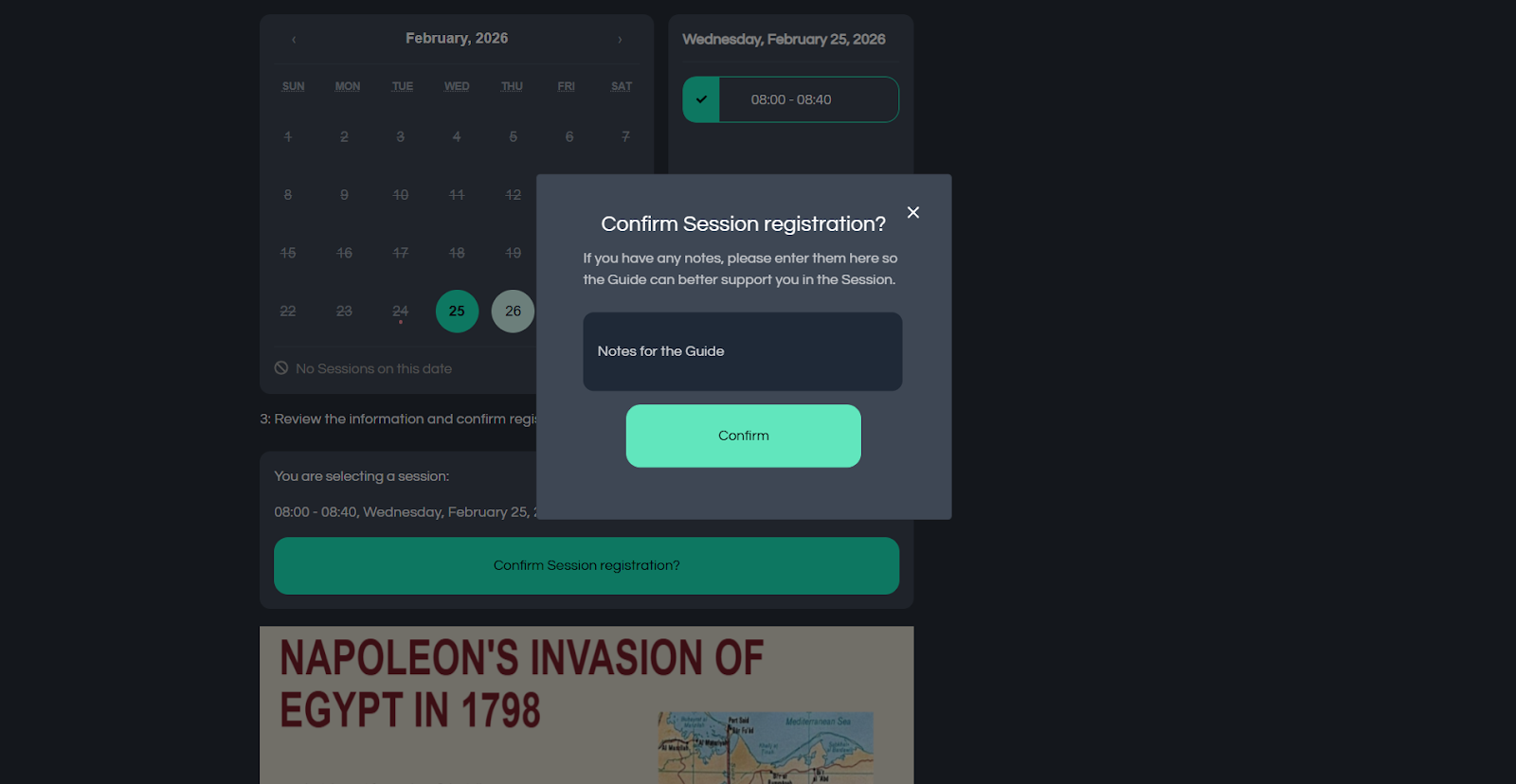 Explorer can leave any notes or issues to be aware of in the notes for the Guide field (if any) and clicks “Confirm” to complete the Session registration.