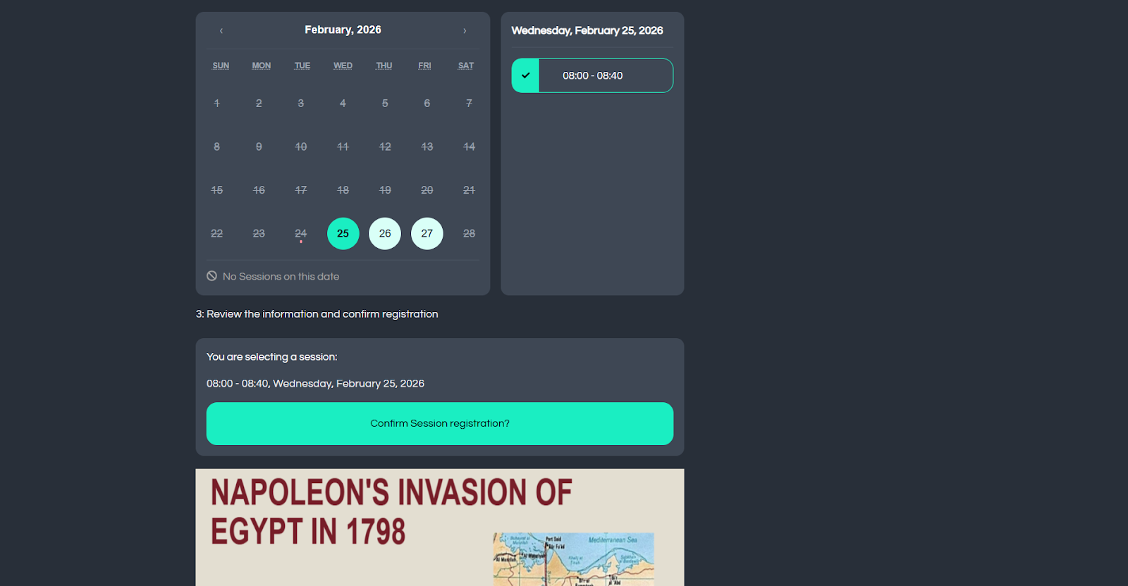 Explorer chooses preferred date & time and selects “Confirm Session registration?”