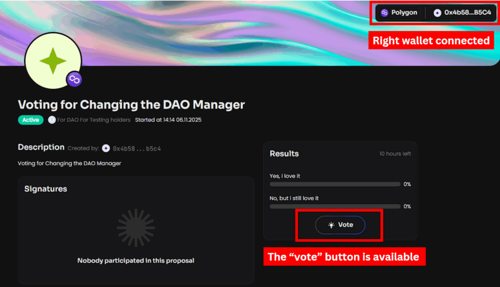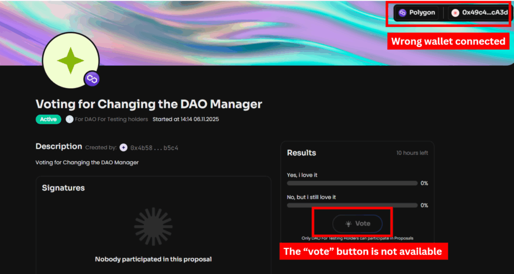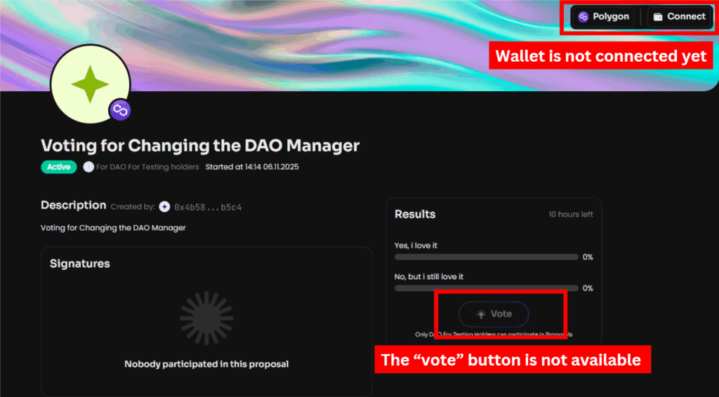 • Once connected, refresh the page - you should now be able to see the DAO information and vote.