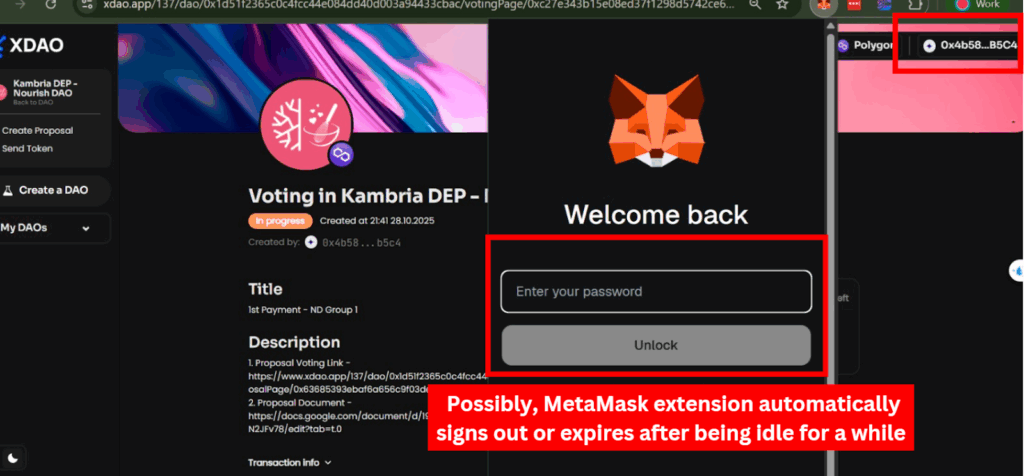 In some cases, the MetaMask extension automatically signs out or expires after being idle for a while (without user interaction). As a result, even though the wallet seems connected to XDAO, transactions (like voting) fail.