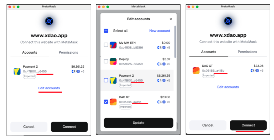 • Confirm the wallet to connect: Check if the wallet address is the one you provided to DEP. If not, click “Edit account” to choose the right wallet. Then click “Confirm”.