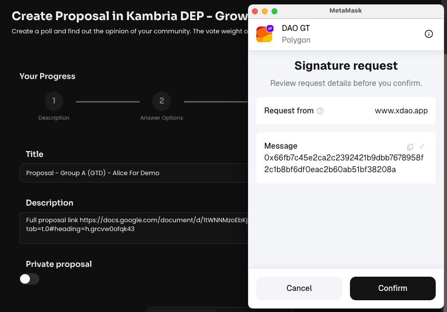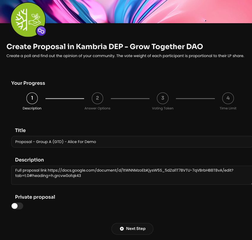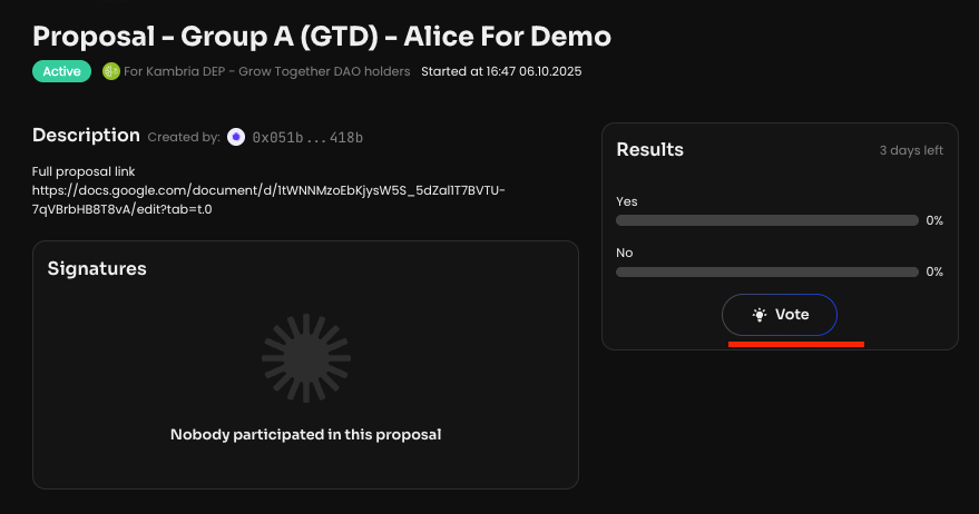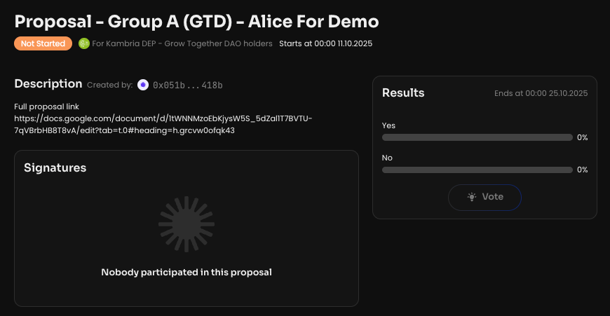 • Create Proposal: Proposal - Group [A/B] ([DAO Code]) - [Proposer Name]