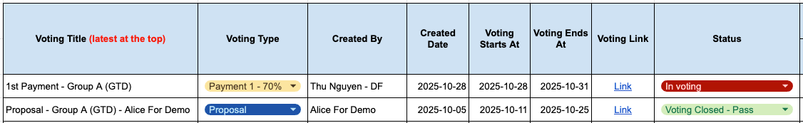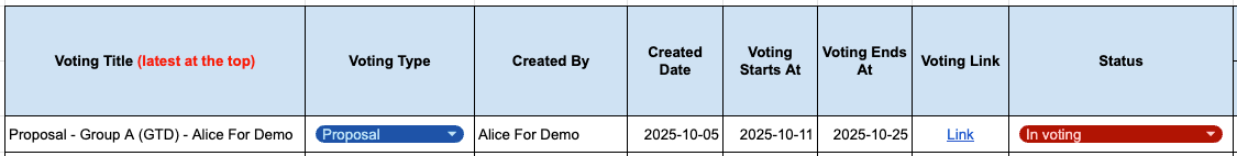 5. Add the voting to the DAO’s Voting tracking sheet.