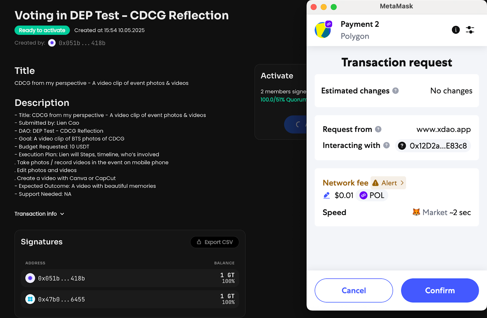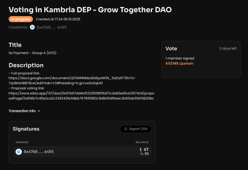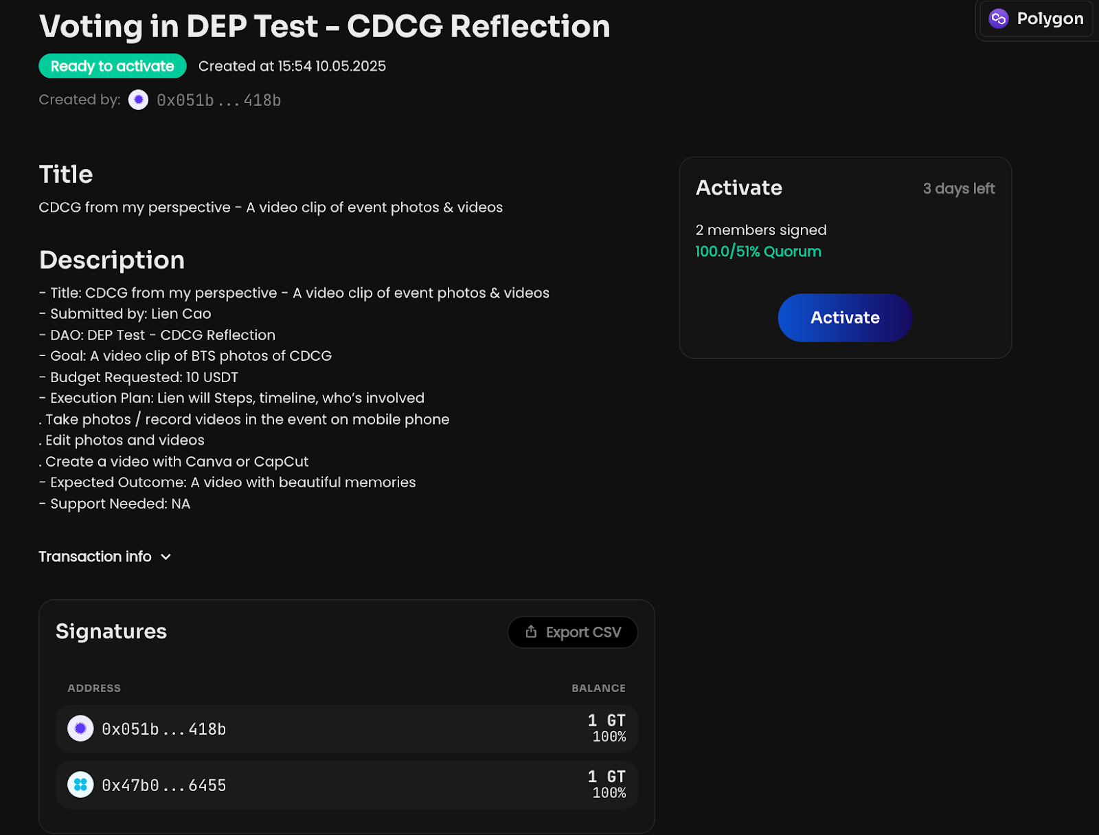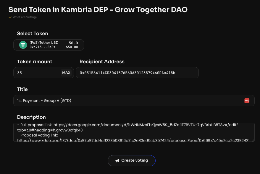 • 1st payment - 70%: Once quorum is met and the proposal is passed, DAO Facilitator will initiate a Send Token voting to transfer 70% of the requested budget (3-day voting period by default).