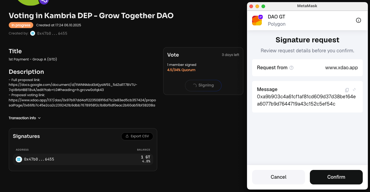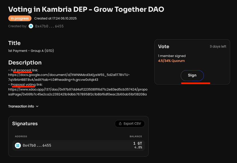 Within 3 days after being notified by DAO Facilitators, DAO members should review and vote on the “Send Token” votings listed in their DAO’s Voting tracking sheet (see DAO-specific links in the Onboarding Hub).