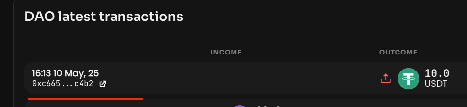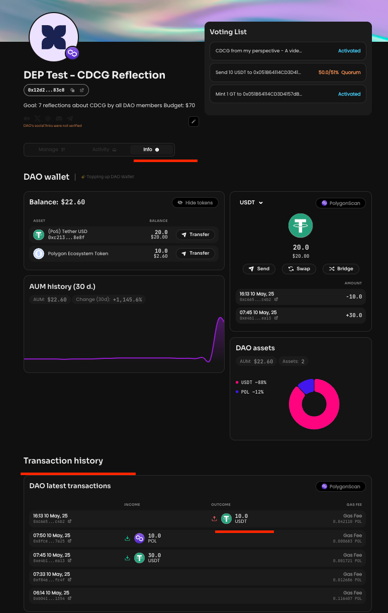1. DAO members can view Transaction information in the tab “Info”, section “Transaction history”: