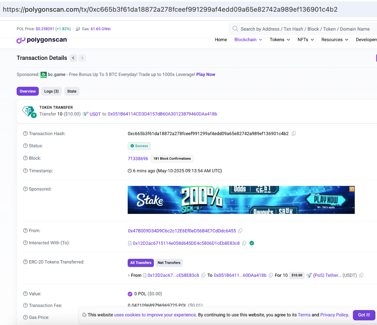 2. Click on Transaction ID to view transaction details on Polyscan: