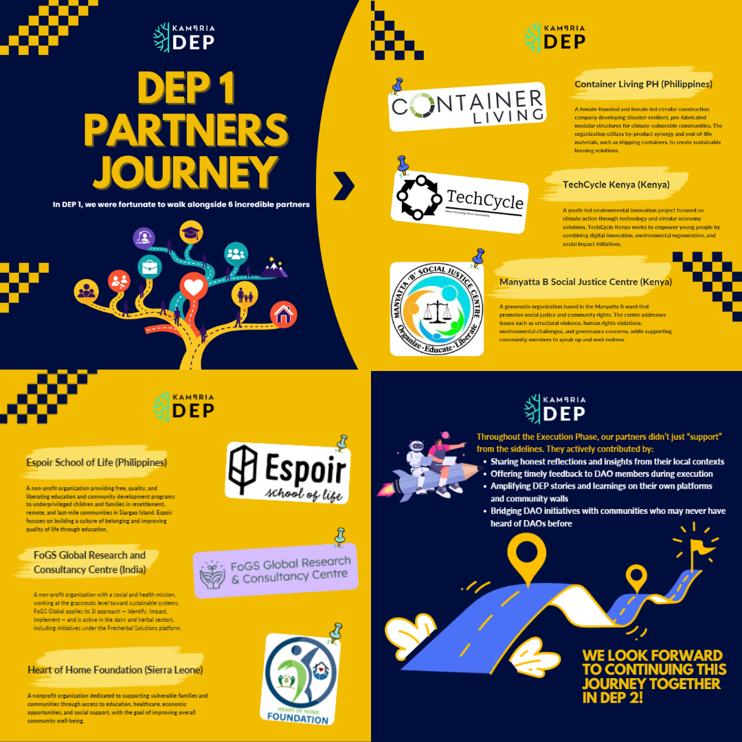 In DEP 1, we were fortunate to walk alongside ๐Ÿ” ๐ข๐ง๐œ๐ซ๐ž๐๐ข๐›๐ฅ๐ž ๐ฉ๐š๐ซ๐ญ๐ง๐ž๐ซ๐ฌ: ๐‚๐จ๐ง๐ญ๐š๐ข๐ง๐ž๐ซ ๐‹๐ข๐ฏ๐ข๐ง๐  ๐๐‡ (๐๐ก๐ข๐ฅ๐ข๐ฉ๐ฉ๐ข๐ง๐ž๐ฌ), ๐“๐ž๐œ๐ก๐‚๐ฒ๐œ๐ฅ๐ž ๐Š๐ž๐ง๐ฒ๐š (๐Š๐ž๐ง๐ฒ๐š), ๐Œ๐š๐ง๐ฒ๐š๐ญ๐ญ๐š ๐ ๐’๐จ๐œ๐ข๐š๐ฅ ๐‰๐ฎ๐ฌ๐ญ๐ข๐œ๐ž ๐‚๐ž๐ง๐ญ๐ซ๐ž (๐Š๐ž๐ง๐ฒ๐š), ๐„๐ฌ๐ฉ๐จ๐ข๐ซ ๐’๐œ๐ก๐จ๐จ๐ฅ ๐จ๐Ÿ ๐‹๐ข๐Ÿ๐ž (๐๐ก๐ข๐ฅ๐ข๐ฉ๐ฉ๐ข๐ง๐ž๐ฌ), ๐…๐จ๐†๐’ ๐†๐ฅ๐จ๐›๐š๐ฅ ๐‘๐ž๐ฌ๐ž๐š๐ซ๐œ๐ก ๐š๐ง๐ ๐‚๐จ๐ง๐ฌ๐ฎ๐ฅ๐ญ๐š๐ง๐œ๐ฒ ๐‚๐ž๐ง๐ญ๐ซ๐ž (๐ˆ๐ง๐๐ข๐š), ๐‡๐ž๐š๐ซ๐ญ ๐จ๐Ÿ ๐‡๐จ๐ฆ๐ž ๐…๐จ๐ฎ๐ง๐๐š๐ญ๐ข๐จ๐ง (๐’๐ข๐ž๐ซ๐ซ๐š ๐‹๐ž๐จ๐ง๐ž) โ€” local delivery partners, CSOs, NGOs, and impact-driven organizations โ€” who brought the DAO Experimentation Program closer to real communities on the ground.