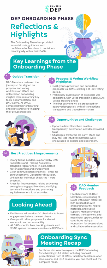 The Onboarding Phase has built a strong foundation for members to experiment, collaborate, and take ownership within their DAOs. With tools, guidance, and a culture of transparency in place, DEP Members are ready to bring their ideas into action.