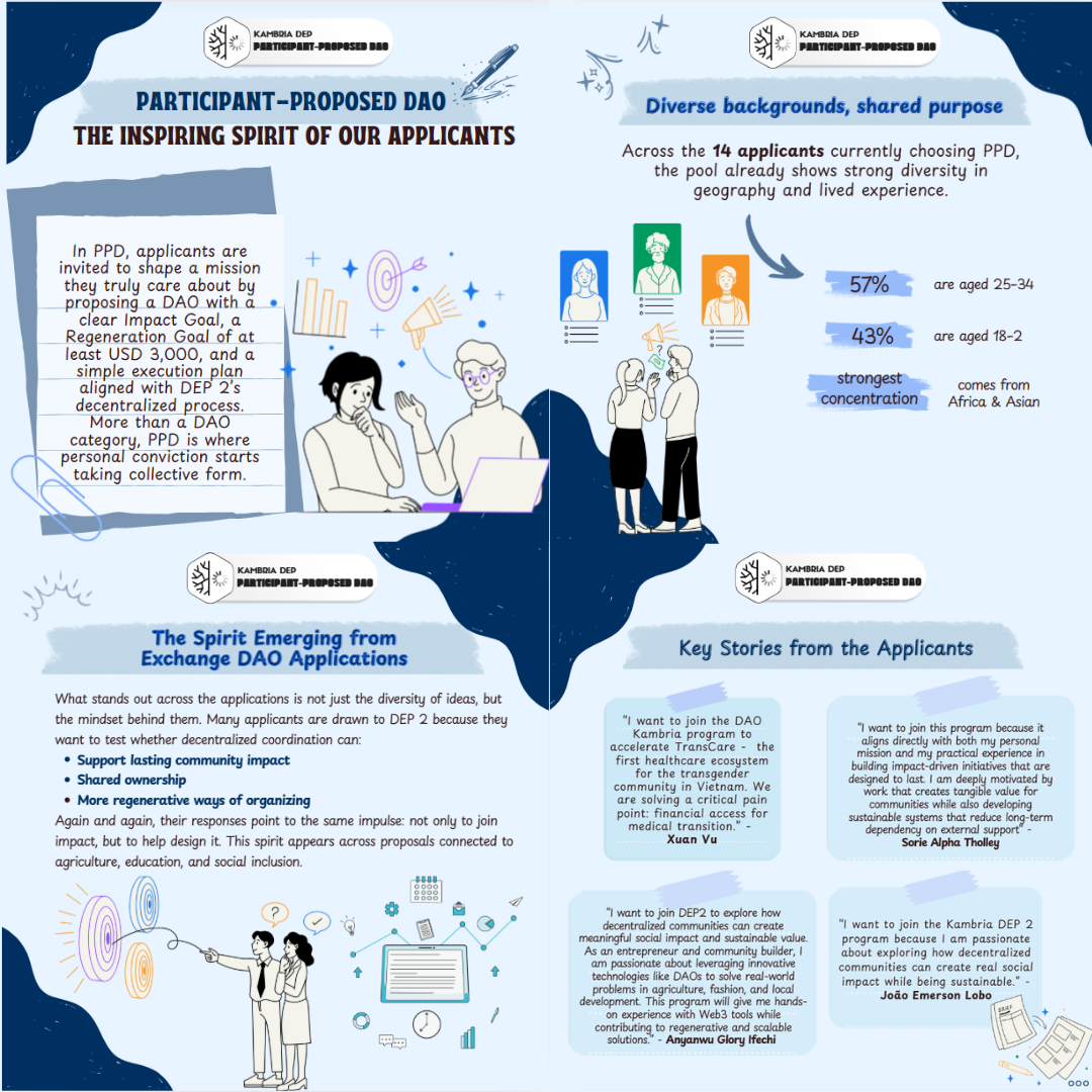 Across the 14 applicants currently choosing PPD, the pool already shows strong diversity in geography and lived experience. From the applicant rows that are clearly visible in the tracking extract, about 57% are aged 25โ€“34, while around 43% are 18โ€“24. Geographically, the strongest concentration comes from Africa, with visible applicants spanning Guinea, Nigeria, Kenya, Mozambique, Sierra Leone, and Cรดte dโ€™Ivoire, alongside proposals connected to Asia such as Indonesia, Vietnam, and the Philippines. What connects these different backgrounds is a shared mindset: many applicants are already rooted in grassroots agriculture, education, youth empowerment, media, cultural preservation, or rural community development, and are now looking to explore how decentralized collaboration can help turn local initiatives into more community-owned and regenerative impact models.