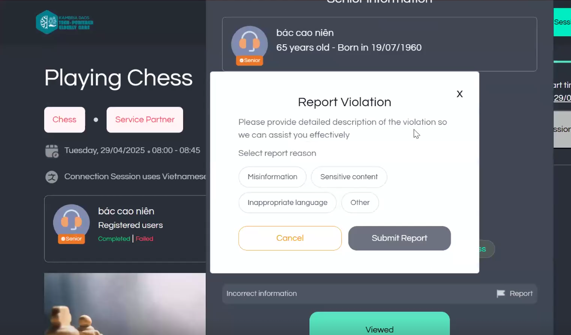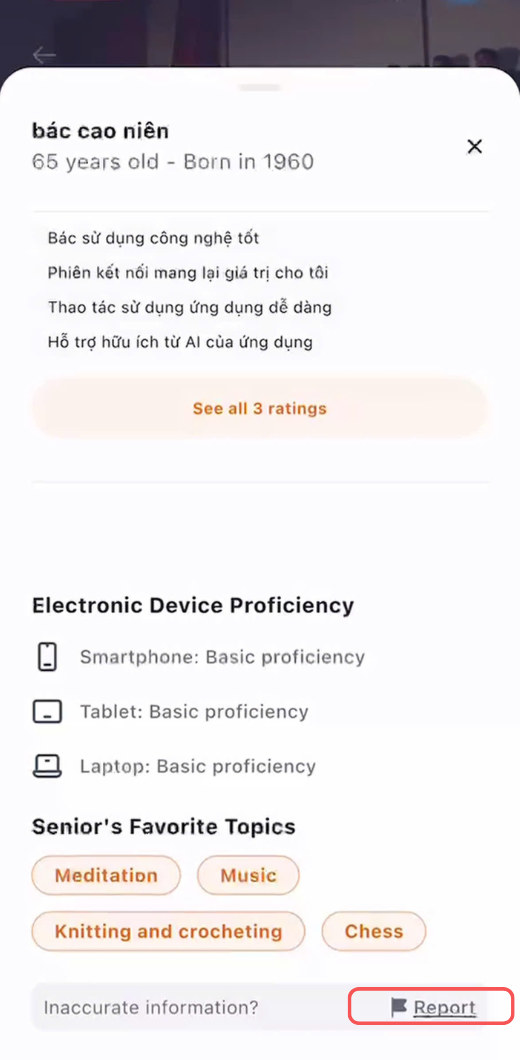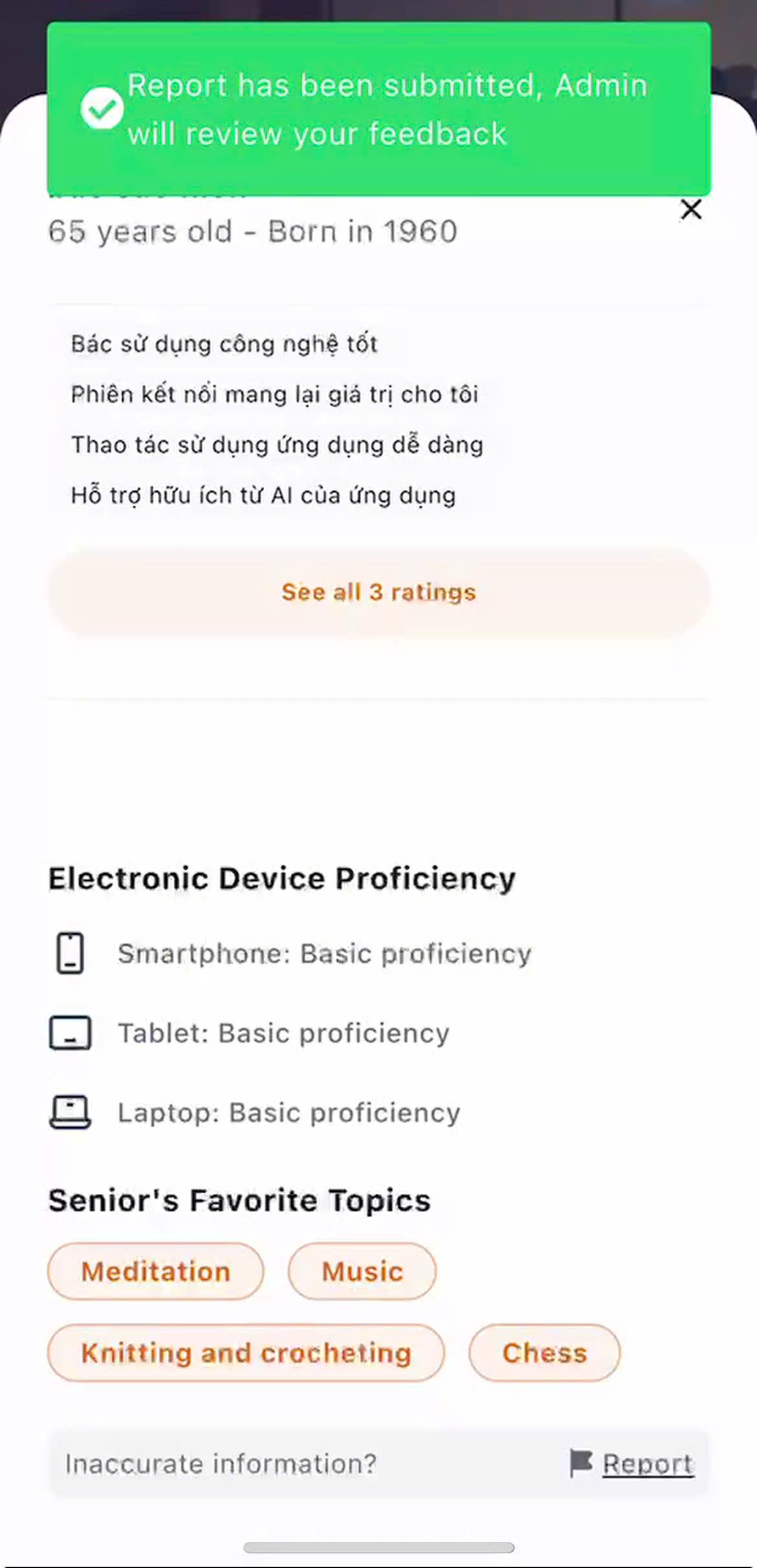 If you notice that a Senior's profile violates the community standards, you can report it directly through the app. The TECD team will review your report and take appropriate action.