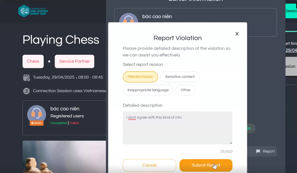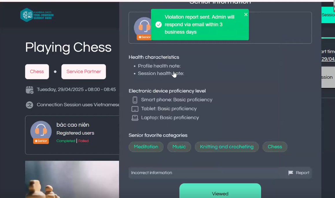 If you notice that a SeniorBuddy’s profile violates the community standards, you can report it directly through the app. The TECD team will review your report and take appropriate action.
